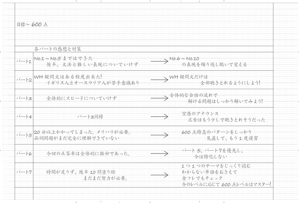 パート毎に感想と対策を書き出し、自分の弱点等を明確化しておくと可視化し易い。